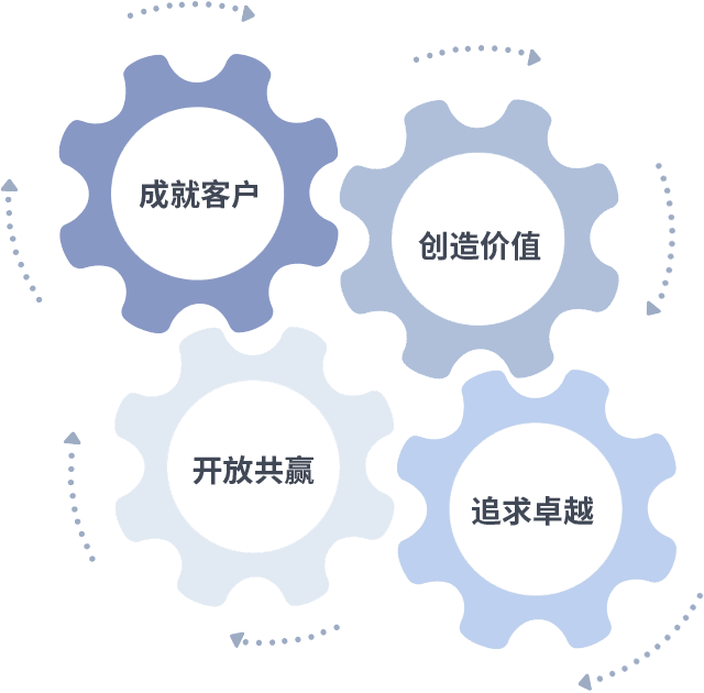 成就客户是一切决策的出发点,,创造价值是衡量所有工作的标准,,追求卓越是我们做事做人的态度,,,开放共赢是我们的格局也是最终的结果。。价值观的齿轮环环相扣,,推动着组织里的每个人不断向前。。